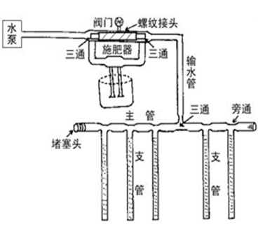 2、输水管道。是把供水装置的水引向滴灌区的通道。输水管道上需要安装过滤器,以防铁锈和泥沙堵塞。同时要安装压力表阀门和肥料混合箱。